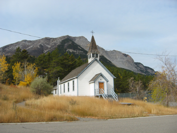 In that year there was a horrendous explosion in the mine and 189 souls perished. A service for 151 was held on main street, accompanied by the local welsh choir (many of the miners were welsh). The remaining services were held in the local churchs over the next couple of weeks. In 1925 the Methodists united with the Presbyterians and Congregationalists to form the United Church. The church was completely re-furbished by volunteers in the late 1980s. It was jacked up and moved back to allow digging a basement, but at one point it fell off its pilings and damaged one corner. The steeple broke and needed replacing, and the interior required renovating, but the miners were concientious builders and created a solid structure that was not damaged. Even though the church had just been re-furbished and had a thrving and energetic congregation, it was closed in 1994-5 by the dioscese in a re-organization of the Crowsnest corridor. It was then sold, and is now under private ownership.